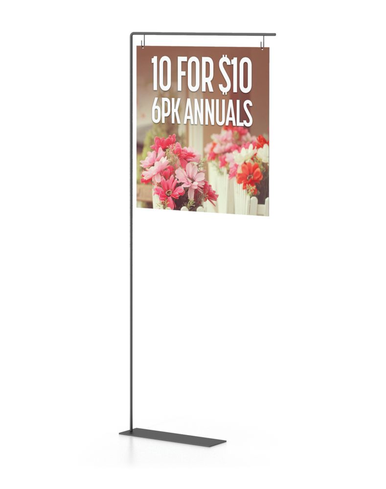 These units make great pallet sign holder combo kits because they are designed to easily integrate with rigid, styrene or paper graphics. The PLT-1 adjustable pallet sign holder is a heavy duty shovel base pallet stand made with telescopic aluminum tubing that adjusts to up to 72” high and comes in a standard satin silver finish. It has a 24” cross bar with hooks fixed at 18” on center to easily hang graphics. Instead of hanging graphics from the hooks, this height adjustable sign holder also works as a pole pocket sign holder. Easily slide pole pocket graphics over the top crossbar.