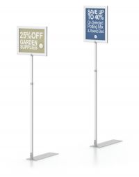 These units make great pallet sign holder combo kits because they are designed to easily integrate with rigid, styrene or paper graphics. The PLT-1 adjustable pallet sign holder is a heavy duty shovel base pallet stand made with telescopic aluminum tubing that adjusts to up to 72” high and comes in a standard satin silver finish. It has a 24” cross bar with hooks fixed at 18” on center to easily hang graphics. Instead of hanging graphics from the hooks, this height adjustable sign holder also works as a pole pocket sign holder. Easily slide pole pocket graphics over the top crossbar.